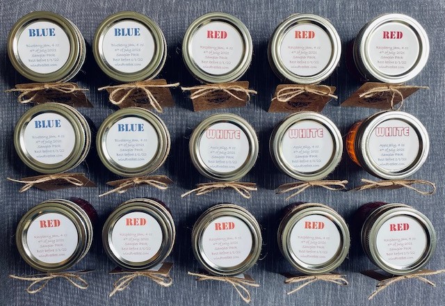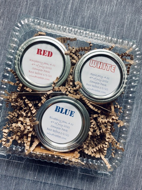 Which means our table is offering some fun things to celebrate. I’ll have a sampler pack of red, white & blue jams and jelly — a trio of 4 oz jars of red raspberry jam, white apple jelly, and blueberry jam.