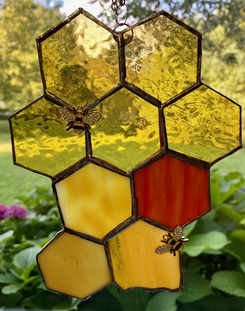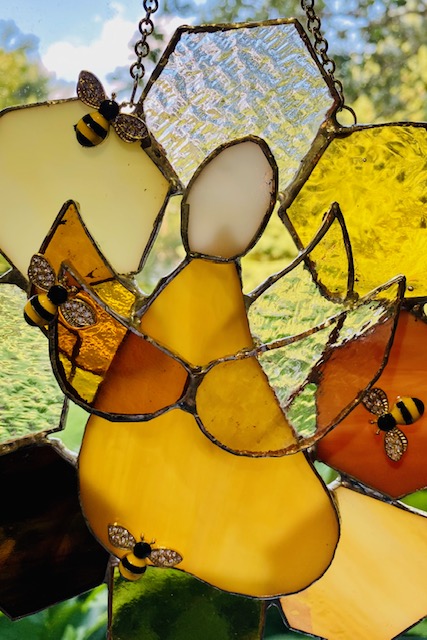 I also have new, gorgeous suncatchers from my niece & nephew’s glazier grandma, Mary Nolan. She designs beautiful, bespoke bee and honeycomb glass for me.