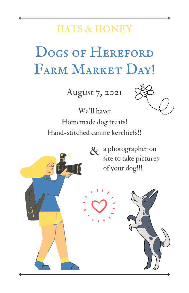 My daughter, Haley, will be at the “Hats & Honey” table tomorrow to take pictures of all of the gorgeous and amazing DOGS OF HEREFORD FARM MARKET!! If you want her to take a picture of your dog, or a picture of you and your dog, then just come to our table. It’s free. No purchase necessary — although of course we’d love it if you bought some honey, biscuits, or kerchiefs — but it’s not required.