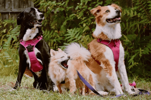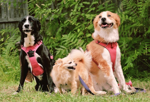 Cookie Bear and Ginger Bear are border collies. Border collies are another working dog breed, but they are herders, not guard dogs. This breed originated along the border of England and Scotland. Theo, in the middle, is a Pomeranian Chihuahua mix. Pomchis are gorgeous, feisty lapdogs who were bred to be companionable and awesome.