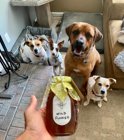 Okay, so this pic wasn’t taken at the market — but I wanted to include it because some of these dogs have visited our table this season. Dog rescuer Karen Dubs is fostering the big guy, Bruno, and has adopted the other three. Check out Karen’s book, Adopting Joy, the story of how she found, rescued, and adopted Stella.