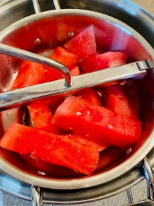 Earlier this week, I bought three huge watermelons and got to work making this week’s offerings: watermelon lemonade jelly and cinnamon watermelon rind pickles. Wow! It was a lot of work — but worth it. After all, capturing summer in a jar is no easy feat! ๐Ÿ˜€
