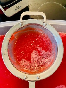 Even though making the watermelon recipes took two days (the rinds have to brine overnight), it was fun! And I was able to use the food mill that my mother-in-law gave me earlier this summer for my birthday. (When I first heard of food mills, I was skeptical. It reminded me of the old hand-crank beaters that everyone used to make whipped cream with. But, unlike a manual whipped cream beater, no one has come up with a way to improve what a food mill does, which is separate large seeds and pulp when pureeing. Food processors and electric blenders puree everything together, which is gross if you have bitter seeds or too much pulp.)