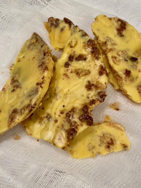 We started with a huge bucket of unrendered wax. It was so heavy, I thought we’d get soooooo many candles out of it. Like 100 or more. We took a quarter of the unrendered wax and put it in a double boiler. (I’d bought two inexpensive pots for just this purpose.) Fast forward forty-five minutes or so and we’d basically created a mangled sausage omelette.
