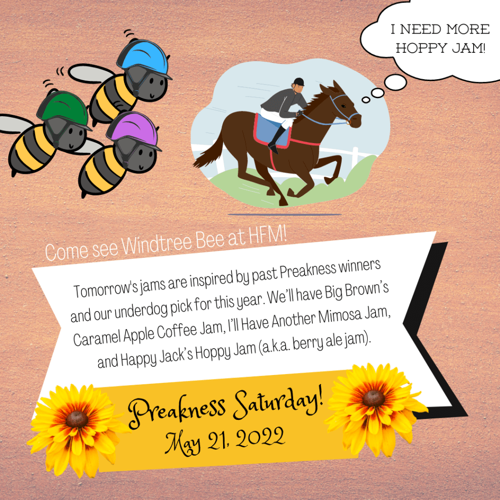 Tomorrow’s jams are inspired by past Preakness winners and our underdog pick for this year. We’ll have Big Brown’s Caramel Apple Coffee Jam, I’ll Have Another Mimosa Jam, and Happy Jack’s Hoppy Jam (a.k.a. berry ale jam). Stop by and tell us your pick for this year’s race!