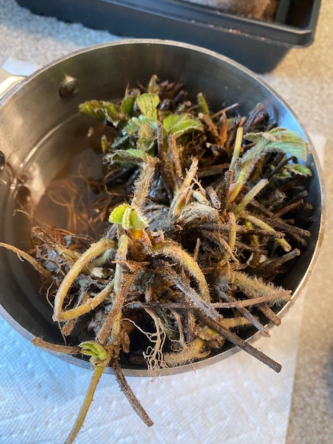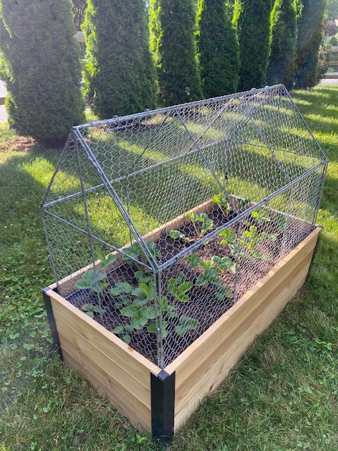 Craig and I are trying to grow our own strawberry patch. I ordered a bunch of live strawberry roots, which arrived in the mail a few months ago. They were adorable – little Baby Groots. I planted them in pots and stuck them under our grow lights in the basement. They thrived and were ready for planting sooner than we had anticipated. There was some mad scrambling on our end to get the raised beds ready, but we’re excited about this project and very hopeful we’ll have our own strawberries next summer.