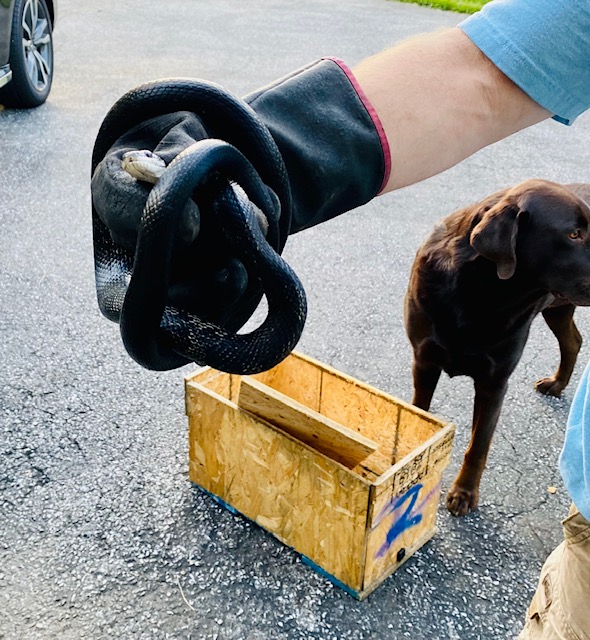 A black rat snake?! Craig used a swarm catching box to take him to his new home.