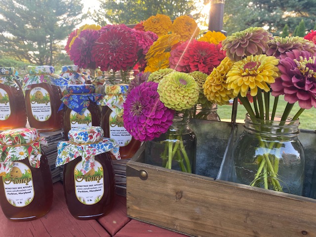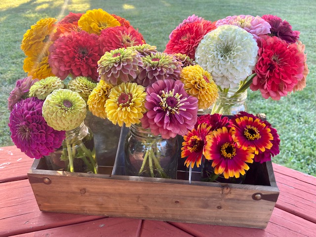 Our Mason jar bouquets have zinnias in them. That’s it. But they’re pretty and every jar you buy supports our queens and their hives — remember Elphaba, Buffy, Cleo, Gaia, Tempest, and the rest? #supportlocalroyalty 😀