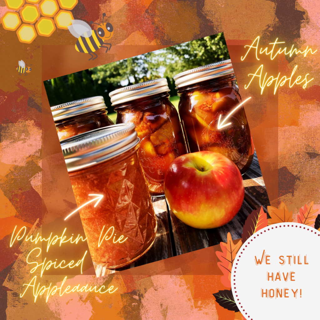 Come see us tomorrow at the Hereford Farm Market! We’ll have pumpkin pie spiced applesauce, autumn apples studded with raisins & cherries (perfect for oatmeal, ice cream, French toast, or to add to homemade stuffing), and one pound jars of our 2022 honey. We’ll also have cottage bouquets and our artisan stained glass suncatchers. Look for us at the “Hats & Honey” table across from The Contented Rooster. Hope to see you there! 🙂