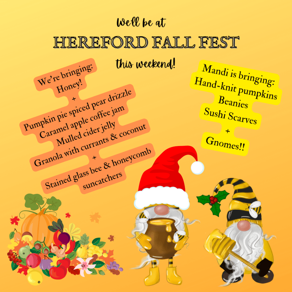 The weather looks great! Mandi and I will be there with expanded offerings. I’m bringing honey, caramel apple coffee jam, mulled cider jelly, pumpkin pie spiced pear drizzle, chewy almond granola with currants & coconut, and HONEY!! Mandi is bringing hand-knit pumpkins, pumpkin beanies, sushi scarves, and felted GNOMES!!