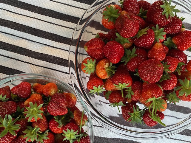 Honey-sweetened strawberry jam: I’m excited about this batch because it was made with strawberries we grew and honey we harvested – neat, right? Because my strawberry patch is small, I supplemented it with some of Krista’s awesome berries. Foggy Bottom Berry Farm grows different varieties than we do, so the mix is delicious!