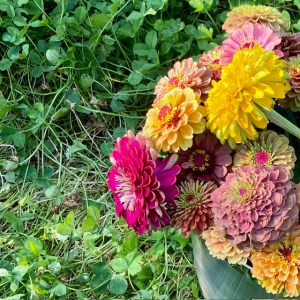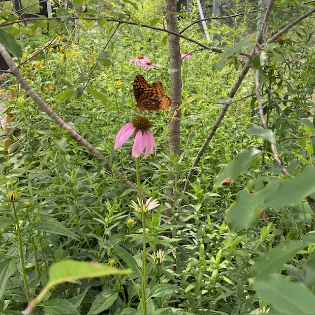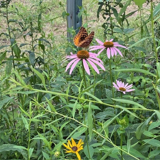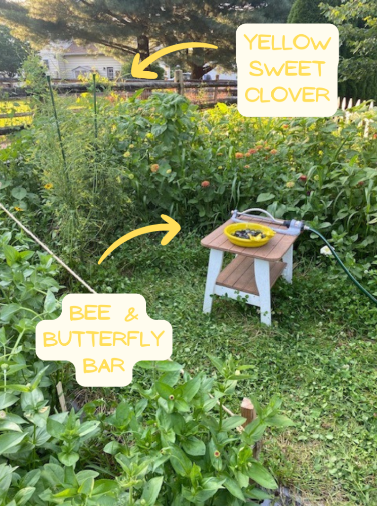One silver lining is that the pollinators don’t care about the weeds. In fact, they’re thriving amongst the chaos. Because of that, I’m being selective about what I yank out. A bunch of mint and three ginormous yellow sweet clover plants sprouted up in the middle of our white clover walkway. I left them. The yellow sweet clover is always covered in different types of bees, but was quickly growing to overtake the entire middle of my garden. I gathered up all of the overflowing branches/vines/tendrils and gently staked them.