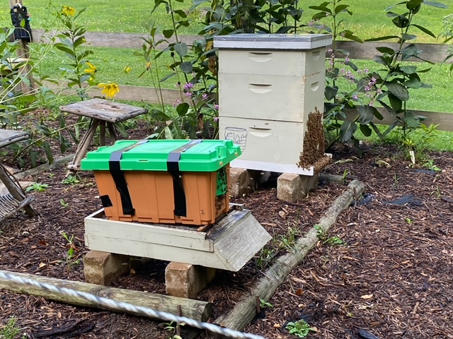 We were going to give celebrity Queen Scarlett and her now experienced retinue to a local beekeeper for overwintering, but when our Pittsburgh beekeeper friends arrived last Sunday, it seemed like fate. They are both biology teachers and are working to have their beautiful two-acre property Audubon Certified. They had room for an extra hive, so we thought, PERFECT!! We bundled them up for travel in an extra-large mesh laundry bag and sent them west. Everyone arrived safely! They’ll be transferred to a Langstroth hive box that can be winterized later this week.